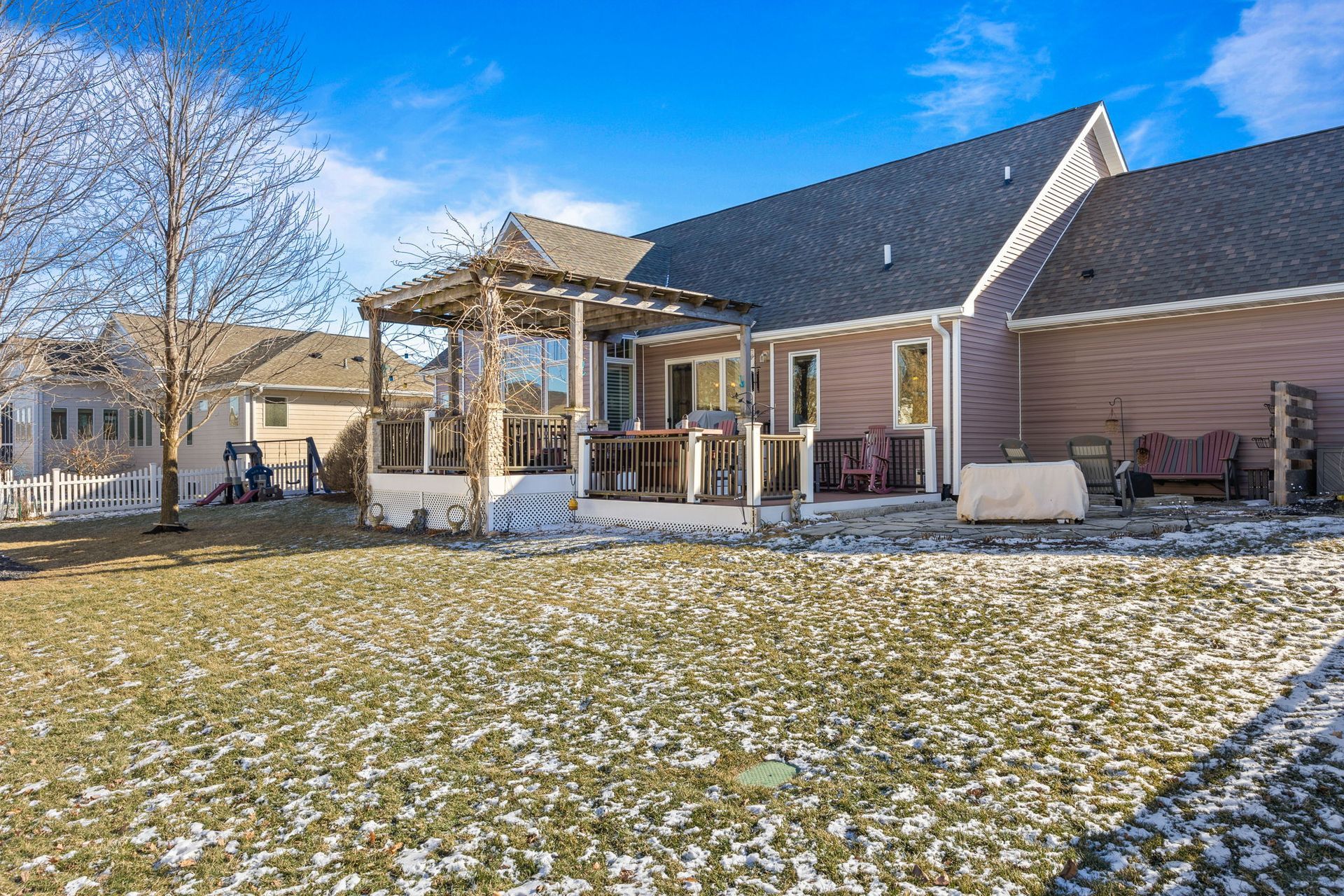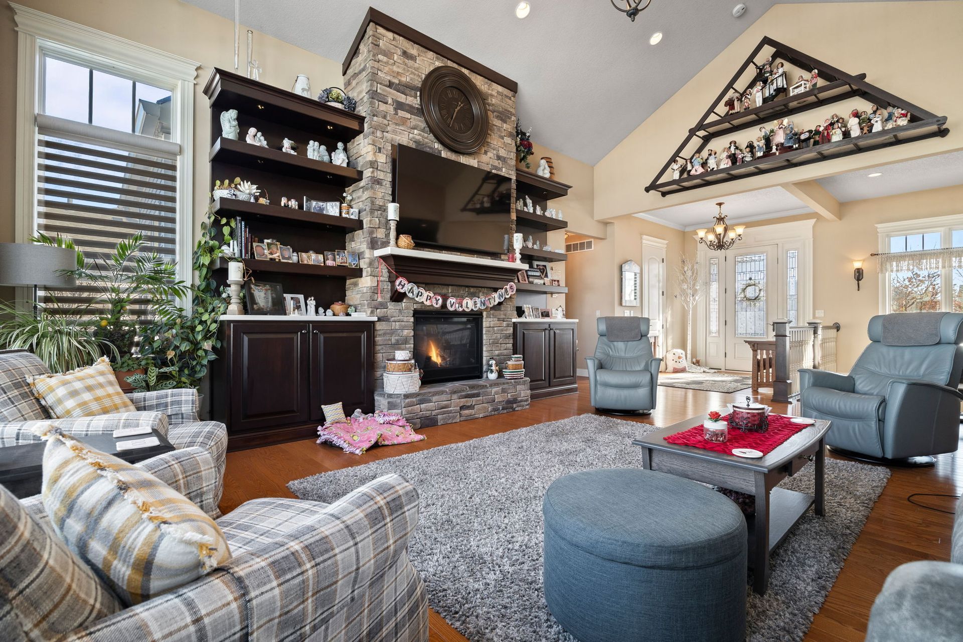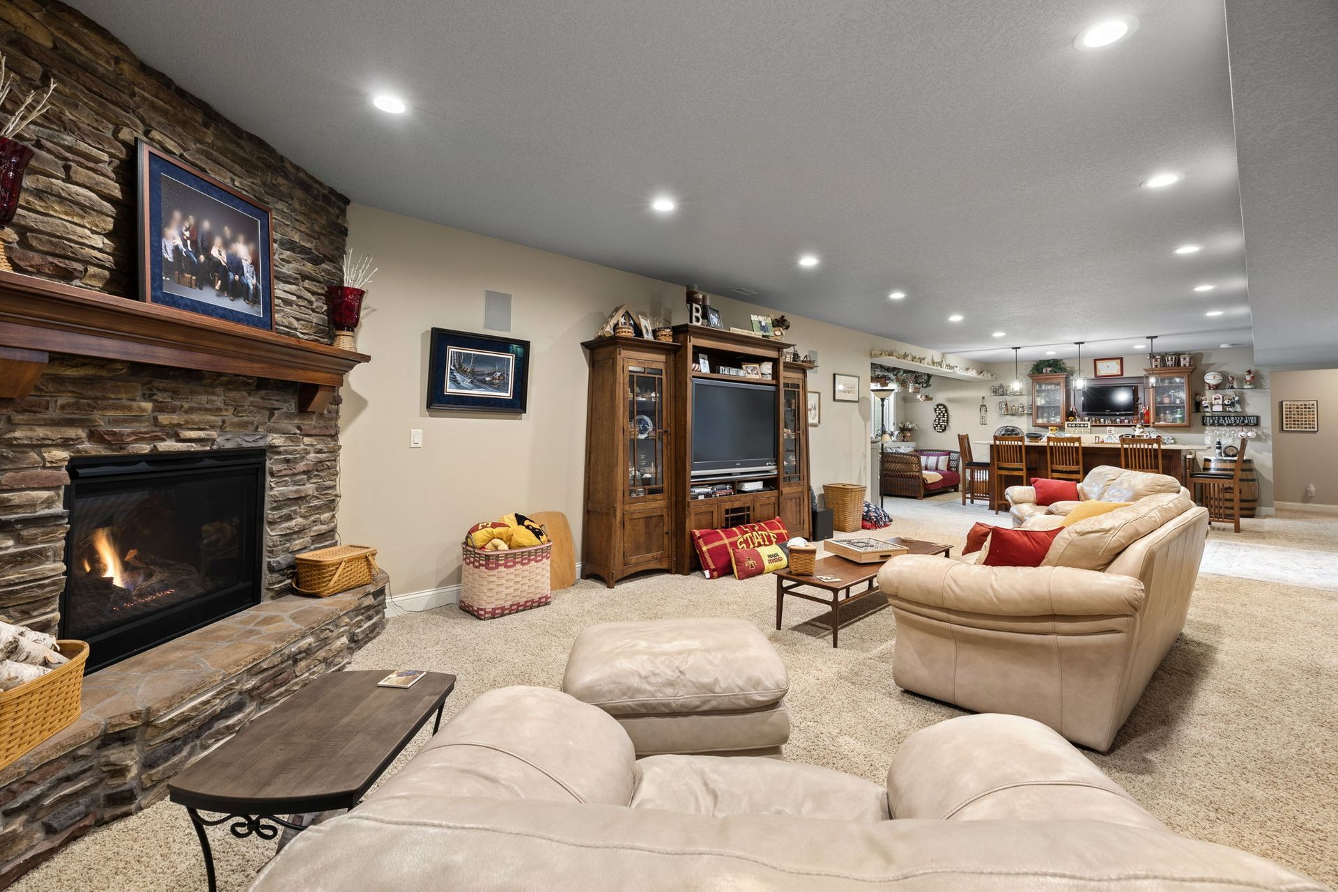 Like to entertain? Enjoy over 3,800 finished square feet in this beautiful ranch-style home featuring detailed woodwork throughout. The home offers large, open spaces with high ceilings and a kitchen showcasing maple cabinetry, double ovens, a large center island, and abundant cabinet space. The kitchen opens to a generously sized dining area and a great room with a fireplace flanked by large built-ins. The main level includes a primary bedroom, a laundry/mudroom with locker-style built-ins, and wood flooring throughout. The home features four bedrooms and three bathrooms, including a jet tub. Additional highlights include a three-car garage, central vacuum, security system, and roughed-in irrigation. The finished lower level offers a wet bar, game room with cork flooring, and wiring for surround sound. Step outside to a spacious deck and patio off the dining room, overlooking a fenced yard with extensive landscaping and plantings.