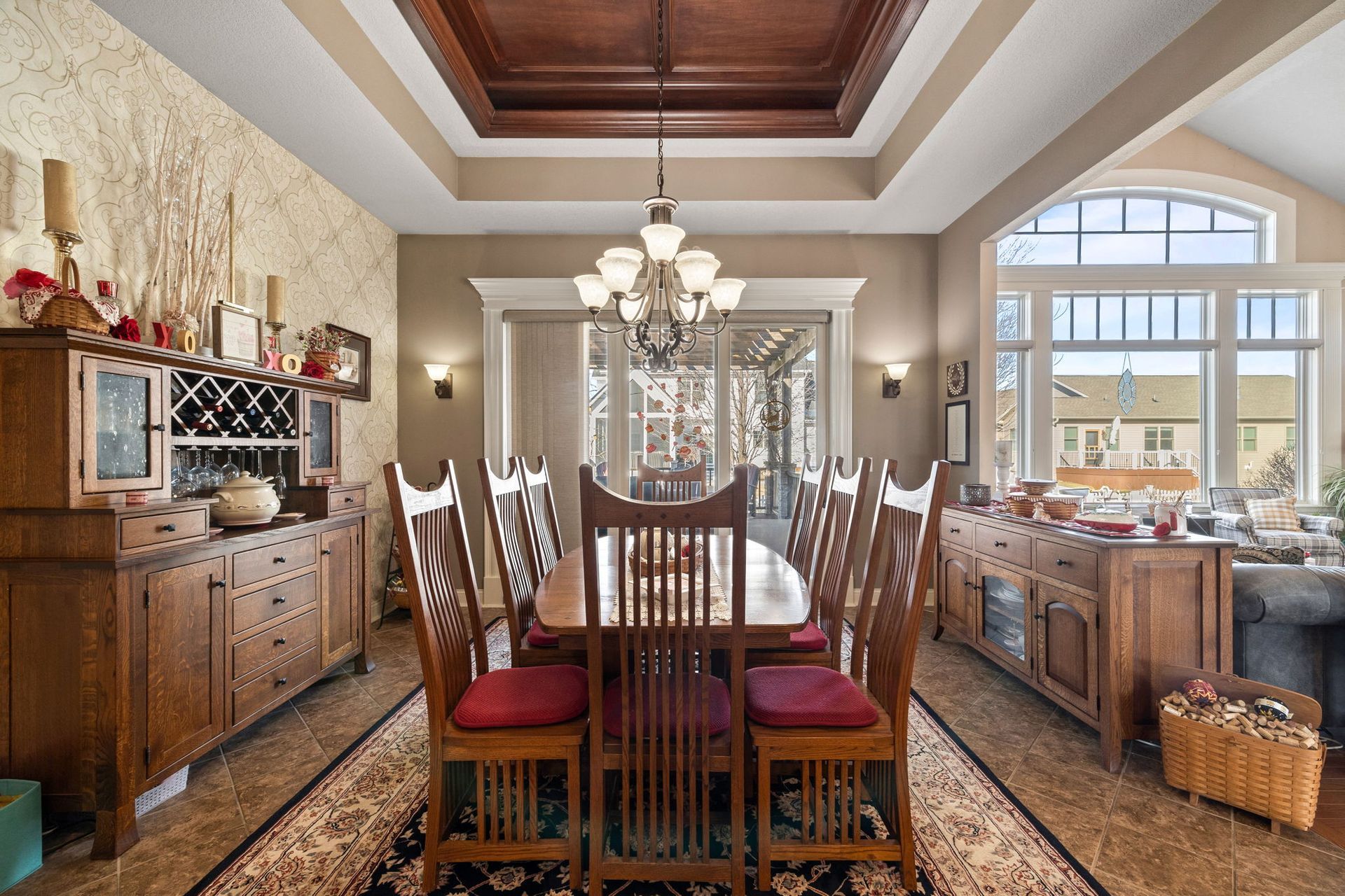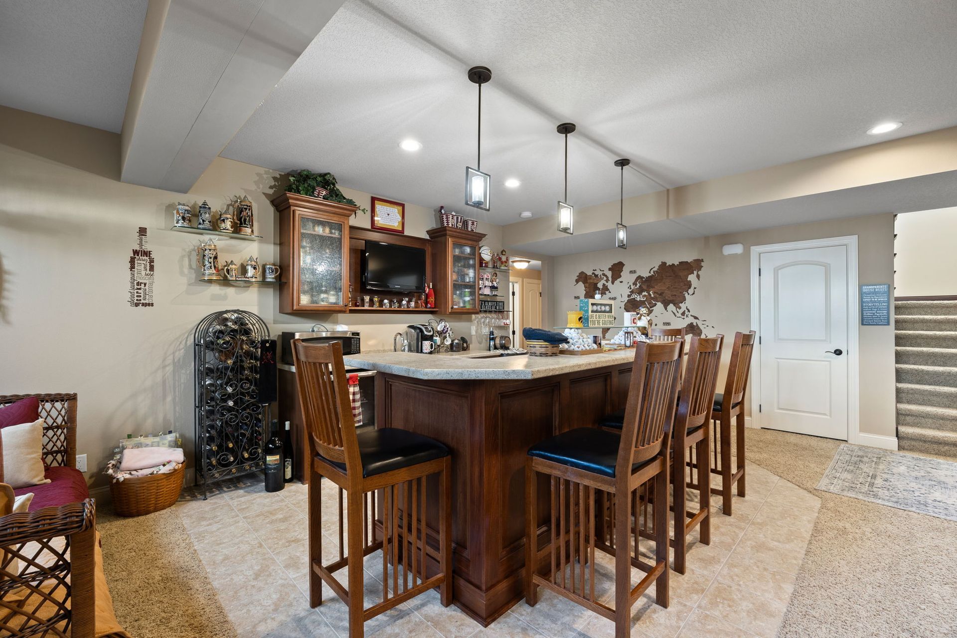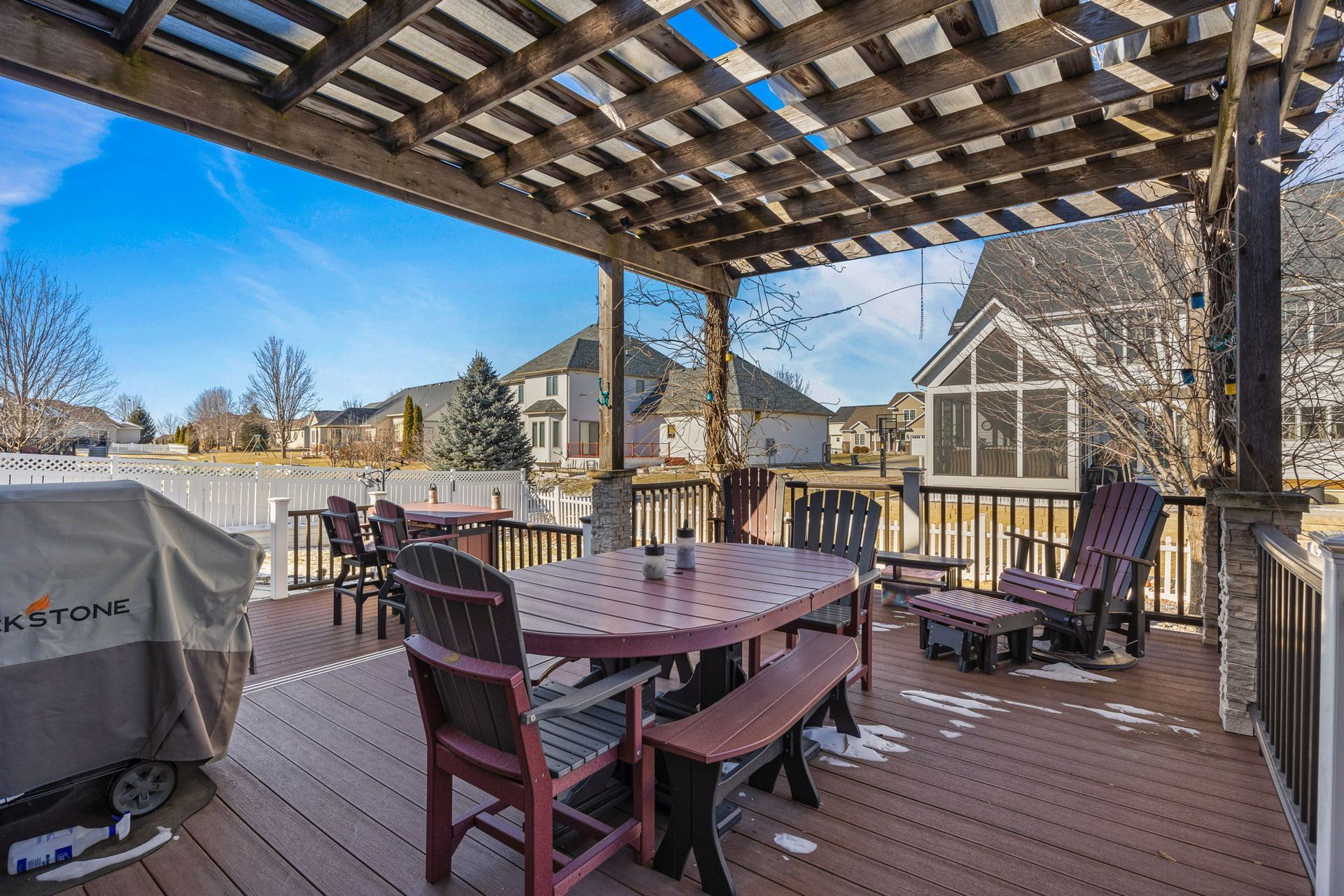 Like to entertain? Enjoy over 3,800 finished square feet in this beautiful ranch-style home featuring detailed woodwork throughout. The home offers large, open spaces with high ceilings and a kitchen showcasing maple cabinetry, double ovens, a large center island, and abundant cabinet space. The kitchen opens to a generously sized dining area and a great room with a fireplace flanked by large built-ins. The main level includes a primary bedroom, a laundry/mudroom with locker-style built-ins, and wood flooring throughout. The home features four bedrooms and three bathrooms, including a jet tub. Additional highlights include a three-car garage, central vacuum, security system, and roughed-in irrigation. The finished lower level offers a wet bar, game room with cork flooring, and wiring for surround sound. Step outside to a spacious deck and patio off the dining room, overlooking a fenced yard with extensive landscaping and plantings.